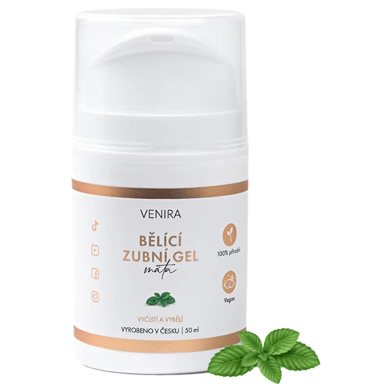 Bělící zubní gel máta od značky VENIRA představuje revoluční řešení pro všechny, kdo touží po zářivějším úsměvu. Tento 100% přírodní a veganský gel účinně odstraňuje skvrny od kávy, kouře a dalších nežádoucích pigmentací, čímž přispívá k viditelnému bělení zubů. Obsahuje speciálně povrchově upravené minerály, které nejenže zpevňují zubní sklovinu, ale také redukují nažloutlé tóny. Jemná mátová příchuť zanechává svěží dech a příjemný pocit v ústech. Použití je snadné a bezpečné, gel je vhodný pro všechny typy kartáčků. Dopřejte svým zubům péči, kterou si zaslouží.