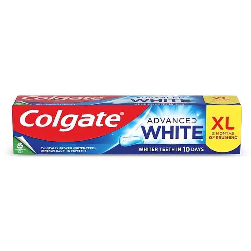 Bělejší úsměv je na dosah s bělící zubní pastou Colgate Advanced White. Tato inovativní pasta obsahuje aktivní mikročistící krystaly, které jemně leští zuby a efektivně odstraňují povrchové skvrny. Klinicky prokázaná formule zajišťuje, že vaše zuby budou bělejší již za 10 dní. Díky duálnímu čisticímu systému odstraní až 10x více skvrn než běžné fluoridové pasty, čímž pomáhá udržet váš úsměv jasný a svěží. Používejte ji dvakrát denně pro optimální výsledky a užívejte si dlouhotrvající efekt. Pro děti do 7 let není určena.