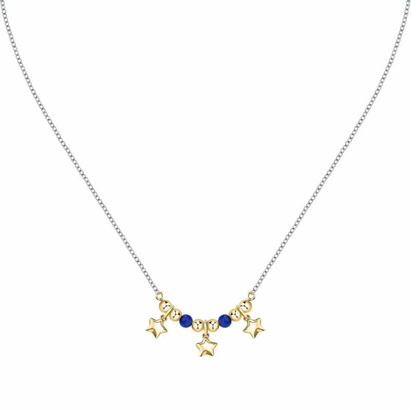 Elegantní bicolor náhrdelník s modrým achátem od italské značky Morellato je dokonalým doplňkem pro každou příležitost. Vyrobený z kvalitní oceli a ošetřený zlatým PVD povlakem, spojuje styl a odolnost. Ozdobený jemnými ocelovými korálky a přívěsky ve tvaru hvězdiček, přináší do vašeho šperkového arzenálu nádech elegance. Délka 45 cm s možností prodloužení o 5 cm zajišťuje ideální fit. Modrý achát dodává šperku jedinečnou barvu a osobitost. Tento náhrdelník je nejen krásný, ale i praktický a snadno se zapíná pomocí karabinky. Ozdobte se šperkem, který podtrhne vaši krásu a osobnost.