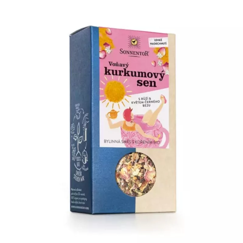 Produkt Voňavý kurkumový sen od značky Sonnentor je květinový čaj s trochou kurkumy pro něžné chvíle. Tato bylinná směs s trochou koření Vám připomene báječné letní dny. Čaj je skvělý i studený a potěší všechny ženy. Květ černého bezu, lípa, levandule nebo růže rozvíjí své květinové aroma na pozadí s trochou kořeněné kurkumy a kardamomu. Šípkové plody dodávají čaji veselou ovocnou chuť. Čaj je čistě bylinkový, neobsahuje žádný tein, je díky tomu vhodný na popíjení i večer nebo před spaním. Jeho jemná květinová chuť s kořeněným nádechem se hodí obzvlášť na snídaně a k zákuskům. Příprava je jednoduchá - čajový sáček na šálek přelejte vroucí vodou a nechte 5 min. luhovat. Vychutnejte si tento lahodný čaj a dopřejte si chvíle relaxace s tímto kvalitním bio produktem od Sonnentor.