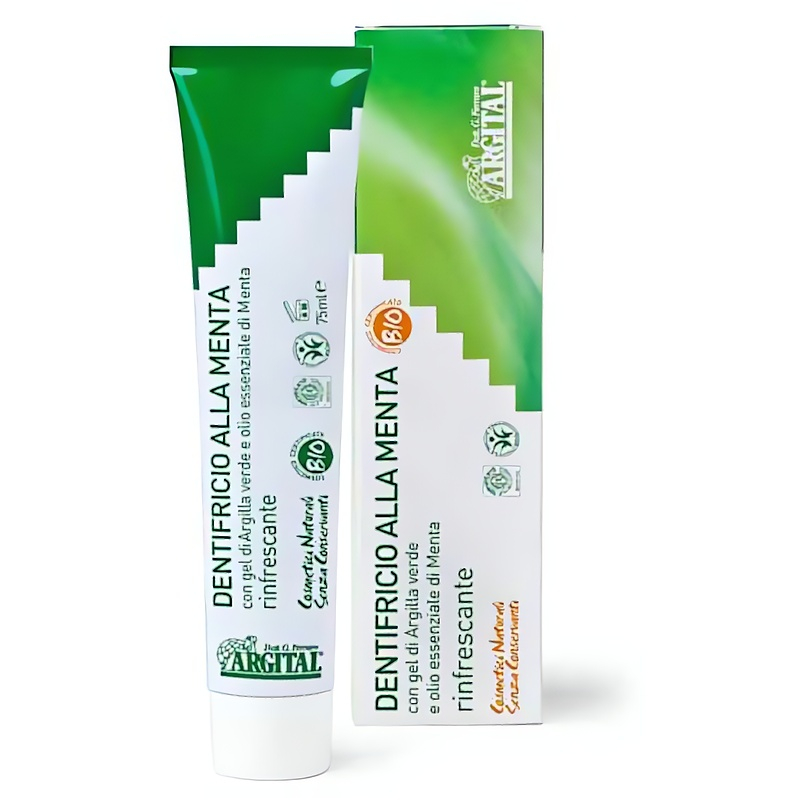 Zubní pasta s mátou a zeleným jílem Argital je ideálním pomocníkem pro zdravou ústní hygienu. Díky svému unikátnímu složení, které zahrnuje bílý a zelený jíl, účinně vyrovnává kyselé prostředí v ústech a absorbuje plak a nečistoty. Tímto způsobem pomáhá předcházet vzniku zubního povlaku a zubního kazu. Obsah esenciálního oleje z máty peprné osvěžuje dech a přispívá k celkové péči o dásně, které chrání před zánětem. Použití je snadné: stačí nanést malé množství pasty na zubní kartáček a jemně čistit zuby. Balení o objemu 75 ml je praktické a vydrží dlouho.