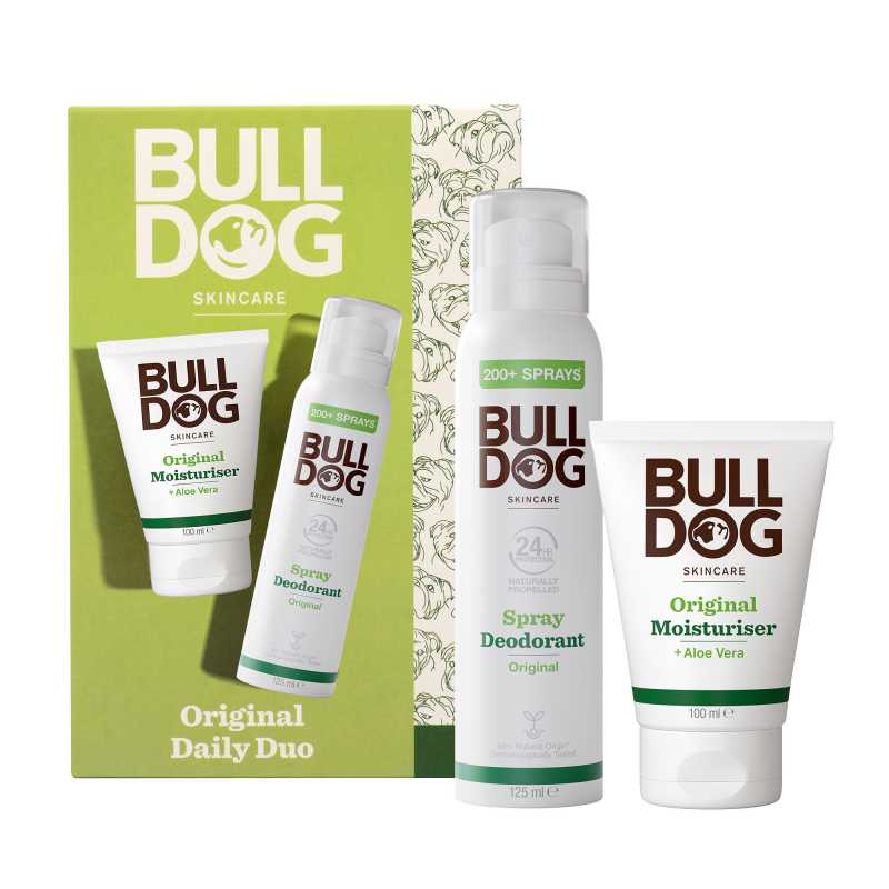 Dárková sada Original Daily Duo od značky Bulldog je ideálním řešením pro muže, kteří hledají efektivní péči o svou pokožku. Sada obsahuje deodorant ve spreji a hydratační krém, které společně zajišťují dlouhotrvající ochranu a svěžest. Deodorant účinně reguluje pocení, zklidňuje pokožku a chrání ji před podrážděním, zatímco hydratační krém vyživuje pleť a dodává jí potřebnou hydrataci. Oba produkty jsou vyrobeny z přírodních ingrediencí, bez umělých barviv a syntetických vonných látek, což je činí vhodnými pro vegany a vegetariány. Dopřejte své pokožce kvalitní péči s touto elegantní dárkovou sadou.