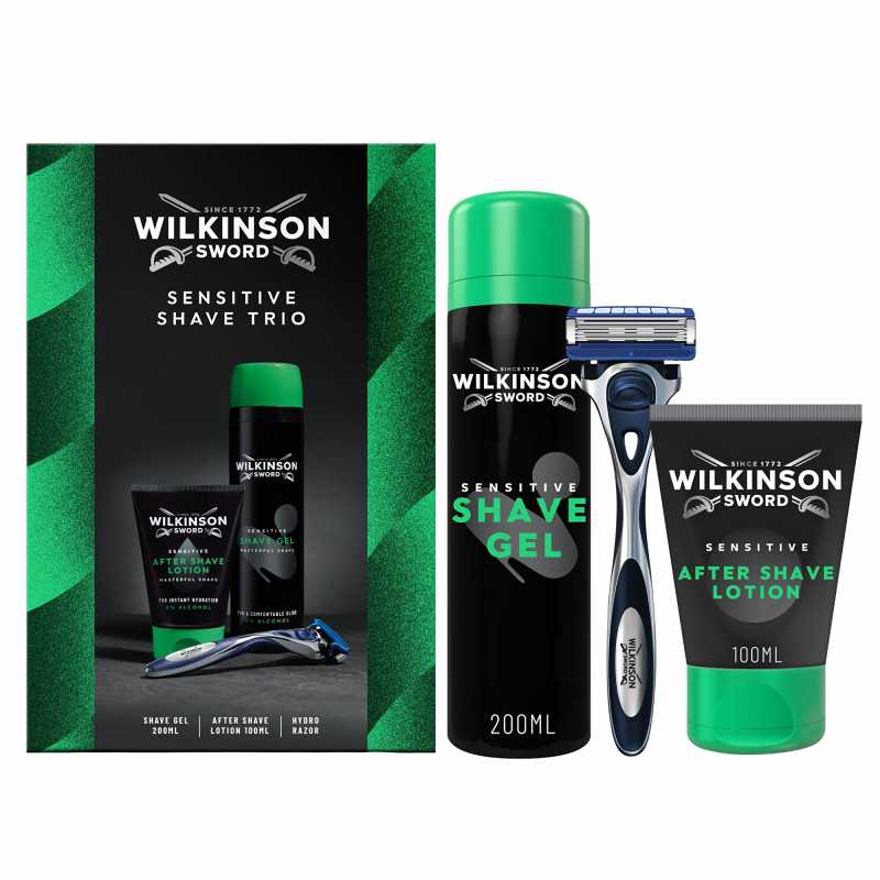 Dárková sada na holení Sensitive Shave Trio od značky Wilkinson Sword je ideálním řešením pro muže, kteří hledají komfortní a efektivní péči o pleť při holení. Sada obsahuje gel na holení Sensitive, který zajišťuje hladké oholení a minimalizuje podráždění pleti. Jeho složení změkčuje vousy a udržuje pokožku hydratovanou a chráněnou. Mléko po holení Sensitive rychle vstřebává a dodává svěží pocit bez mastného filmu. Holicí strojek Hydro 5 s pěti Ultra Glide břity a technologií Skin Guard poskytuje jemné oholení a ochranu pleti. Tato sada je perfektní volbou pro každodenní péči o pleť a pohodlné holení.