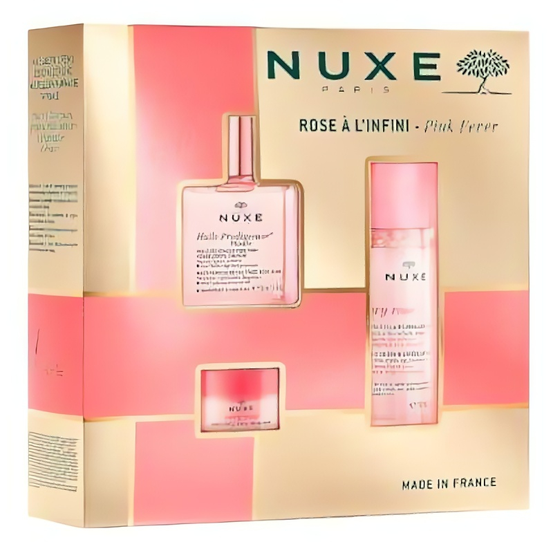 Dárková sada pleťové péče Pink Fever od značky Nuxe je ideálním řešením pro všechny, kdo touží po zdravé a krásné pleti. Obsahuje zklidňující micelární vodu Very Rose, která jemně čistí pleť a odstraňuje nečistoty i zbytky make-upu, aniž by ji vysušovala. Multifunkční suchý olej Huile Prodigieuse Florale s bohatým složením sedmi rostlinných olejů hydratuje a vyživuje pleť, vlasy i tělo, přičemž zanechává příjemnou květinovou vůni. Hydratační balzám na rty Very Rose s extraktem z růžového oleje zjemňuje a chrání rty před vnějšími vlivy. Dopřejte si luxusní péči, která osvěží a revitalizuje.