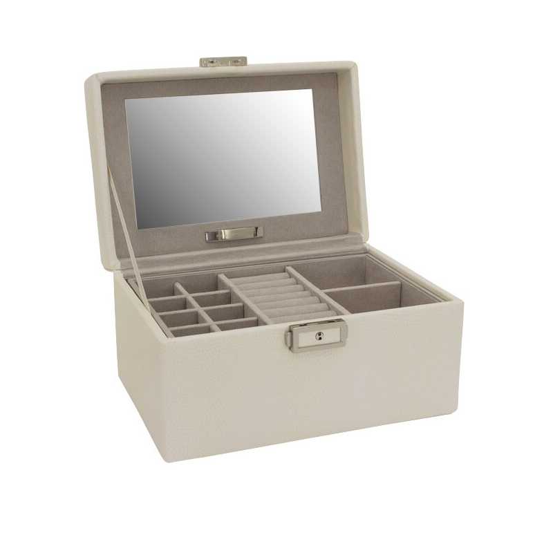 Elegance a funkčnost se snoubí v designové šperkovnici Milano 20142-9 od značky Friedrich Lederwaren. Tento stylový kousek v krémovém provedení s jemným vzorem ještěrky představuje dokonalou harmonii mezi estetikou a praktičností. Interiér šperkovnice v šedém odstínu nabízí dvě patra pro bezpečné uložení vašich cenností, zatímco zabudované zrcátko ve víku usnadňuje rychlou kontrolu vašeho vzhledu. S možností uzamčení a klíčem přiloženým v balení si můžete být jisti, že vaše poklady jsou v bezpečí. Tato šperkovnice je nejen funkční, ale také elegantním doplňkem, který vnesou do každého interiéru nádech luxusu.