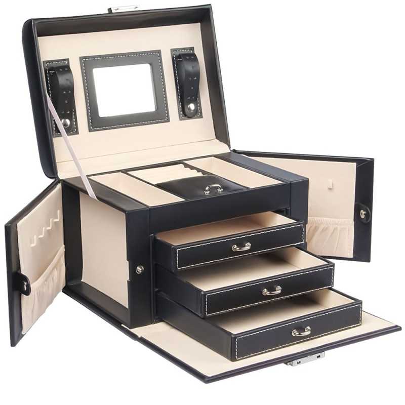 Šperkovnice značky Troli je vyrobena z ekologického MDF materiálu, což zaručuje vysokou odolnost a dlouhou životnost. Povrchová úprava v podobě černé umělé kůže dodává elegantní vzhled a příjemný pocit na dotek. Pro optimální péči o šperkovnici doporučujeme pravidelné otírání měkkým hadříkem, aby se udržela v perfektním stavu. Tento stylový doplněk nabízí prostorné přihrádky na prsteny, náhrdelníky a náramky, což usnadňuje organizaci vašich pokladů. Praktické zrcátko umožňuje snadné zkoušení šperků. S klíčkem v balení budete mít své cennosti v bezpečí. Troli se pyšní kvalitou a precizním zpracováním, což z ní činí ideální volbu pro moderní ženy.