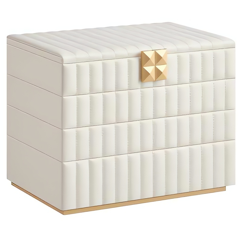 Elegantní šperkovnice Troli kombinuje styl s praktičností. Je vyrobena z ekologického MDF a potažena jemnou krémovou umělou kůží, čímž dodává prostoru nádech luxusu. Vnitřek je potažen měkkým sametem, což chrání vaše šperky před poškrábáním. S prostory na prsteny, náramky a náhrdelníky máte všechny poklady na dosah. Zrcátko umožňuje rychlou kontrolu, zda šperky perfektně ladí k outfitům. Díky kompaktním rozměrům a možnosti vrstvení zásuvek se šperkovnice snadno vejde do každého interiéru. Ideální volba pro moderní ženu, která si cení estetického a funkčního designu.