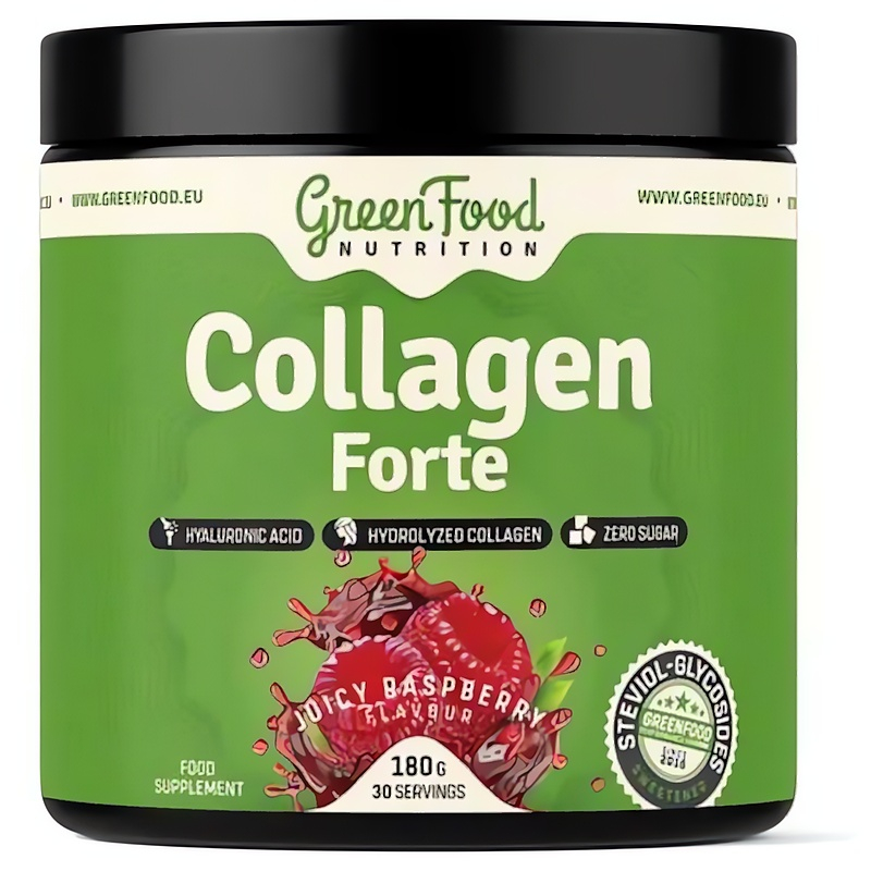 Collagen Forte 180 g s příchutí šťavnaté maliny je vysoce kvalitní doplněk stravy, který kombinuje italský kolagenový hydrolyzát ITALGEL, kyselinu hyaluronovou a přírodní vitamín C z aceroly. Tento produkt přispívá k normální tvorbě kolagenu, což podporuje zdraví kostí, kloubů a pokožky. Díky enzymaticky hydrolyzovanému kolagenu s ideální molekulovou hmotností 1500–5000 Da je zajištěna snadná vstřebatelnost. Kyselina hyaluronová zajišťuje potřebnou hydrataci, zatímco extrakt z aceroly chrání buňky před oxidativním stresem. Užívejte 1x denně rozmíchaný v 300 ml vody pro maximální účinek.