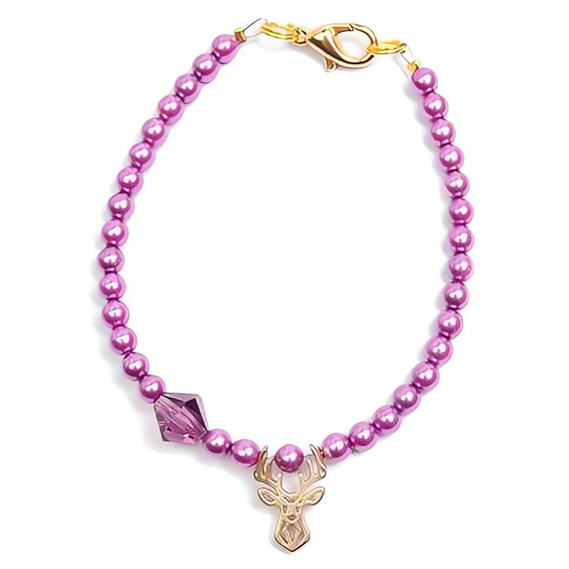 Fialový korálkový mini náramek značky Deers představuje elegantní spojení stylu a přírodní krásy. S délkou 17 cm je ideálním doplňkem pro každou příležitost. Jeho drobné fialové korálky, precizně doplněné pozlacenými kovovými částmi, podtrhují jemnost a eleganci. Přívěsek s tradičním jelínkem, jehož výška činí 1, 5 cm, je ozdobený nádherným fialovým krystalem, který dodává náramku jedinečný lesk. Zapínání na karabinku zajišťuje snadné a bezpečné nošení. Tento šperk je ručně vyroben s důrazem na detail, což z něj činí dokonalý klenot pro milovnice originálních a přírodou inspirovaných šperků.