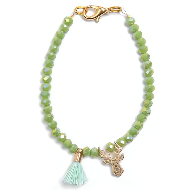 Zelený korálkový mini náramek značky Deers přináší do vašeho šperkovníku jedinečný kousek, který okouzlí nejen vás, ale i vaše okolí. S délkou 16, 5 cm a zapínáním na karabinku se pohodlně nosí a přizpůsobí se každému zápěstí. Tento elegantní náramek je vyroben z drobných zelených korálků, které jsou doplněny pozlacenými kovovými částmi a ozdobným přívěskem jelínka. Malé tyrkysové střapce dodávají šperku hravý nádech. Ruční zpracování zaručuje preciznost a důraz na detail. Náramek je dodáván v originálním balení, ideální jako dárek. Vytvořte si vlastní styl a užijte si každý okamžik s tímto výjimečným šperkem.