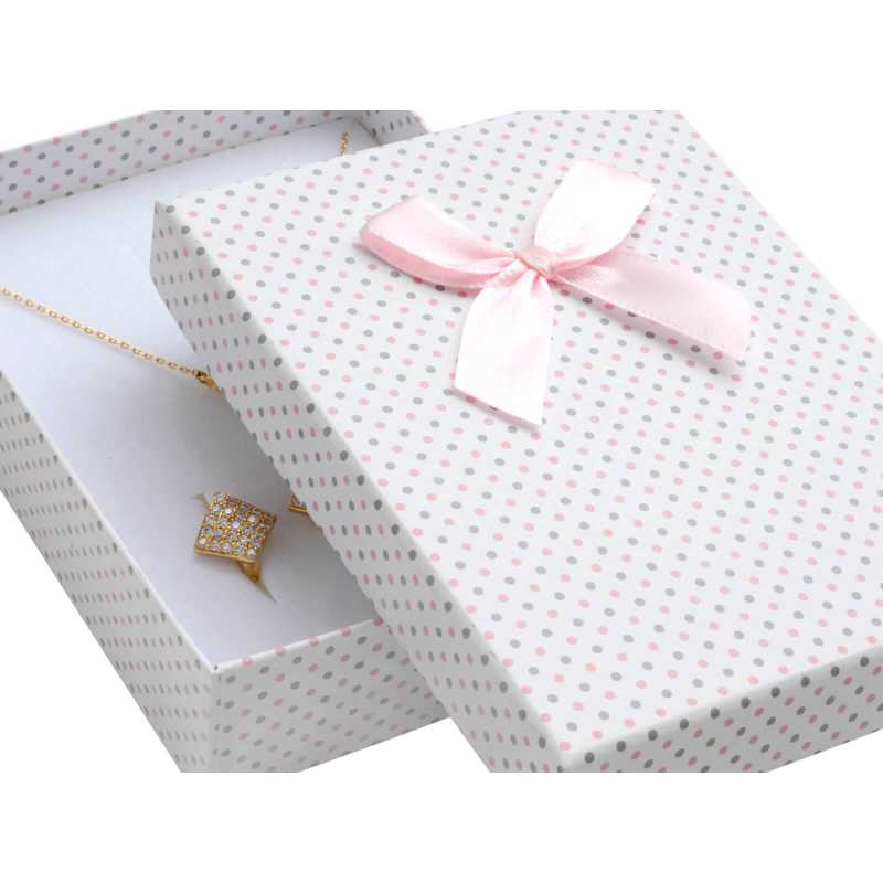 Elegantní puntíkatá krabička na soupravu šperků od značky JK Box je ideálním způsobem, jak obdarovat své blízké. S rozměry 9 x 12 x 3 cm a jemným designem, který zdobí roztomilé mašličky, se stává dokonalým doplňkem pro každý dárek. Ochrání cennosti a zároveň podtrhne jejich krásu. Krabička je vyrobena z kvalitního papíru a nabízena v příjemných barvách – bílé, růžové, světle růžové a šedé. Symbolizuje lásku a pozornost, kterou věnujete každému daru. Tento kousek přidá na hodnotě vašim šperkům a potěší každou ženu.