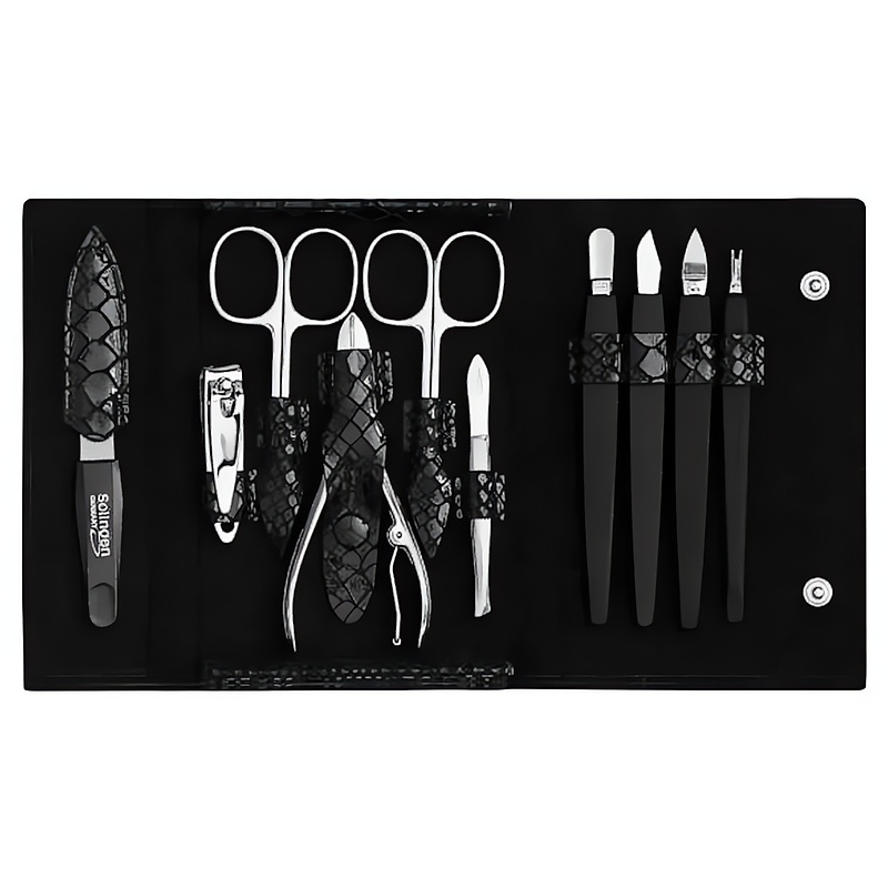 Rodinná manikúrová sada 10 dílná PL 252CNH představuje ideální volbu pro všechny, kdo si chtějí dopřát profesionální péči o nehty v pohodlí domova. Elegantní pouzdro z pravé kůže s hadím motivem dodává této sadě na stylu a praktičnosti. Obsahuje nůžky na nehty, nůžky na kůži, kleštičky a další nezbytné nástroje pro dokonalou úpravu nehtů. Všechny výrobky jsou vyrobeny v Německu, což zaručuje jejich vysokou kvalitu a dlouhou životnost. S touto sadou si snadno poradíte s úpravou nehtů a kůžičky, ať už doma nebo na cestách. Dopřejte si péči, kterou si zasloužíte.