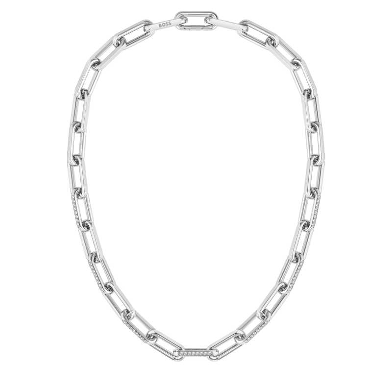 Náhrdelník Halia od značky Hugo Boss v sobě spojuje nadčasovou eleganci a moderní design. Tento šperk s délkou 40 cm je vyroben z vysoce kvalitní oceli a zdobený třpytivými čirými krystaly, které odrážejí světlo v každém pohybu. Větší očka dodávají náhrdelníku robustní vzhled, zatímco lesklý povrch zajišťuje jeho atraktivitu. Tento šperk může symbolizovat sílu a sebedůvěru, kterou vyzařuje každá žena nosící Hali. Díky zapínání na karabinu je nošení pohodlné a bezpečné. Ozdobte se šperkem, který podtrhne vaši osobnost a styl.