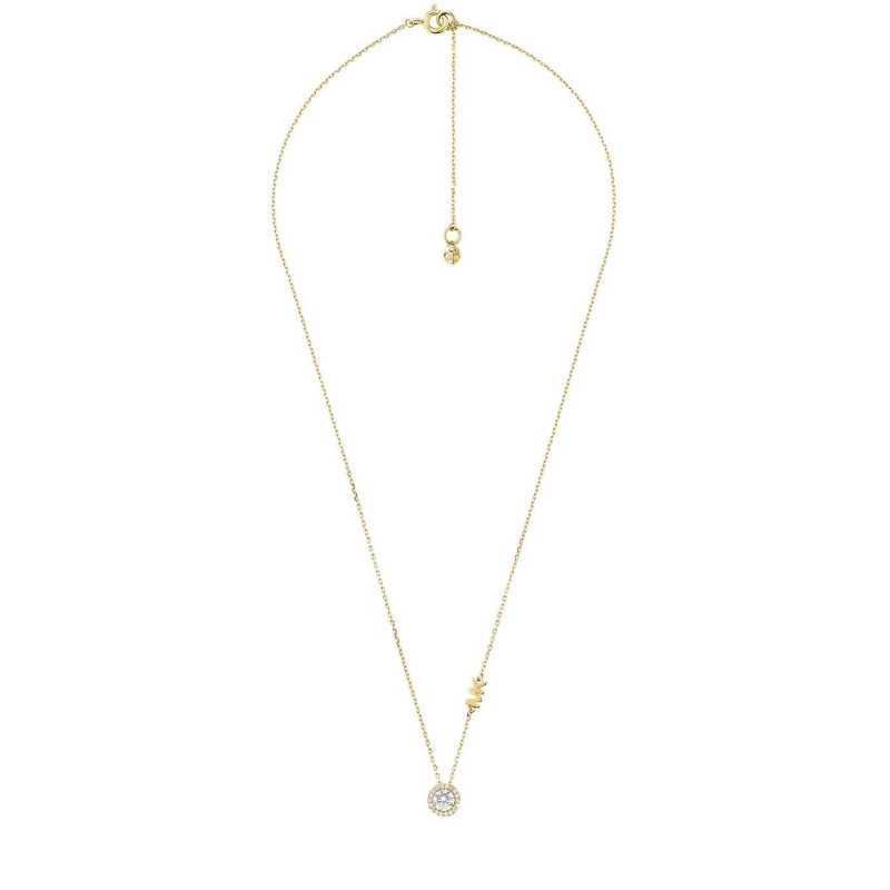 Něžný pozlacený náhrdelník od značky Michael Kors je skvostným doplňkem, který oslní každou ženu. Vyrobený z kvalitního stříbra a pozlacený žlutým zlatem, nabízí elegantní design s kruhovým přívěskem, zdobeným třpytivými čirými zirkony. Délka náhrdelníku činí 38 cm a je možné ji prodloužit o dalších 5 cm, což zajišťuje dokonalé přizpůsobení. Bezpečnostní zapínání na karabinku poskytuje pohodlí a jistotu při nošení. Tento nadčasový šperk se skvěle hodí k různým stylům a příležitostem. Dodá každému outfitu šmrnc a eleganci. Šperk je dodáván v originálním balení.