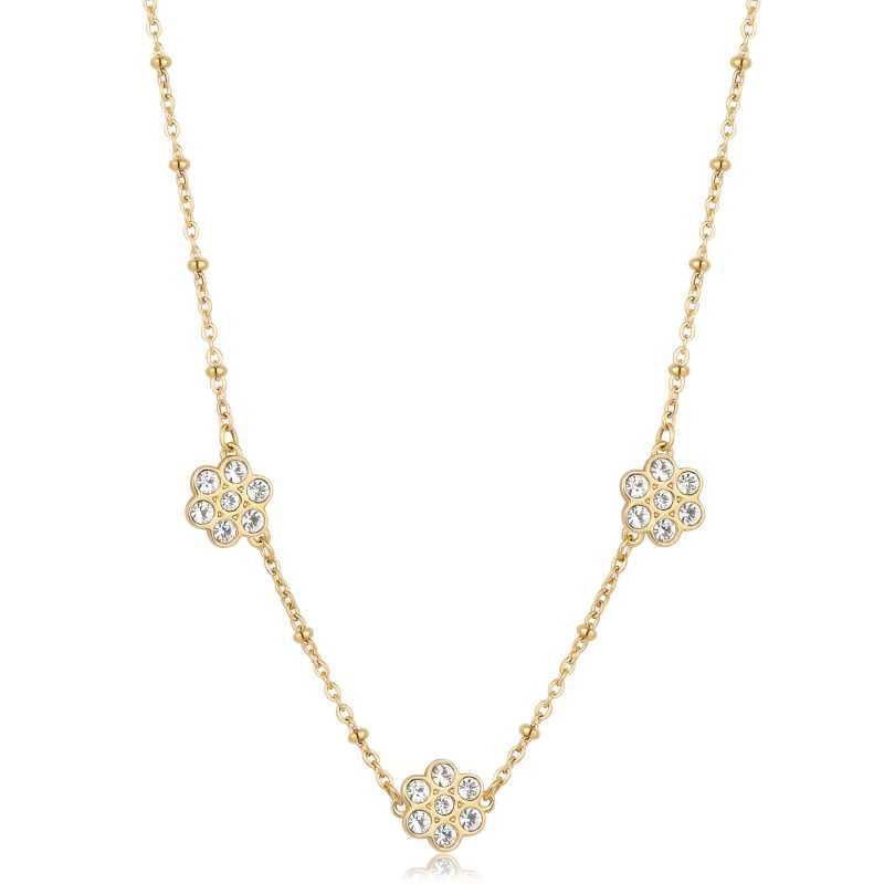 Pozlacený ocelový náhrdelník s květinami Aurora od italské značky S'Agapõ je skvostným doplňkem, který dokonale ozdobí váš dekolt. Délka 44 cm je ideální pro každodenní nošení i slavnostní příležitosti. Ocelová konstrukce s PVD povrchovou úpravou ve 14K zlatě zajišťuje nejen elegantní vzhled, ale také dlouhou životnost šperku. Tři drobné květinové ozdoby, osazené čirými krystaly, dodávají náhrdelníku jemnost a šarm. Zapínání na karabinku zaručuje jednoduché a bezpečné nošení. Tento náhrdelník je skvělou volbou pro všechny ženy, které chtějí vyjádřit svůj osobní styl.
