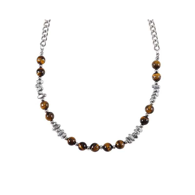Tento moderní náhrdelník z oceli s tygřím okem je dokonalým spojení elegance a stylu. Vyrobený z kvalitní oceli a zdobený ocelovými korálky spolu s korálky z tygřího oka, přináší do vašeho šatníku jedinečný šarm. Délka náhrdelníku 54 cm s možností prodloužení o 5 cm zajišťuje pohodlné nošení, zatímco zapínání na klasickou karabinku usnadňuje rychlé navlékání. Tygří oko, známé pro své ochranné a posilující vlastnosti, dodává šperku hloubku a charakter. Tento náhrdelník je ideální volbou pro muže, kteří hledají stylový doplněk pro každou příležitost. Dodává se v originálním balení, což z něj činí skvělý dárek.
