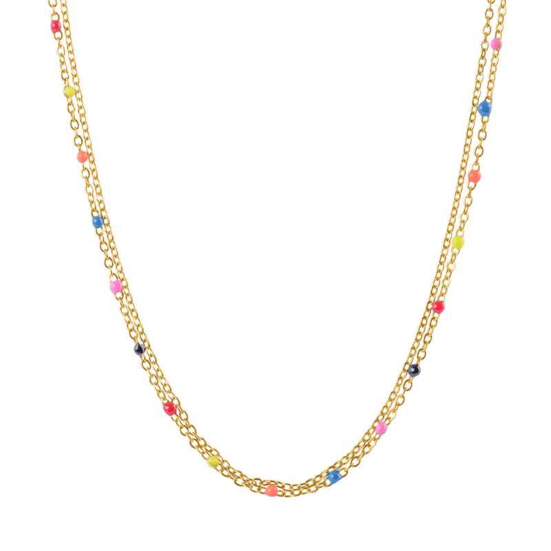 Pozlacený dvojitý náhrdelník se smaltovými korálky od značky Troli je dokonalým doplňkem pro každou ženu, která touží po eleganci a barevné hravosti. Vyrobený z kvalitní oceli s luxusním zlatým PVD povlakem, tento šperk dodává vašemu outfitu jedinečný šmrnc. Dvojité řetízkové provedení s barevnými smaltovými korálky přitahuje pozornost a přidává na originalitě. Délka náhrdelníku činí 46 cm, s možností prodloužení o dalších 5 cm pro maximální pohodlí. Zapínání na klasickou karabinku zajišťuje bezpečné nošení. Tento náhrdelník se skvěle hodí pro každou příležitost a stane se vaším oblíbeným kouskem.