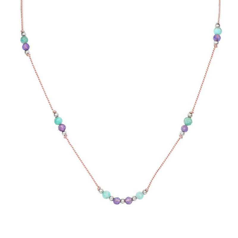 Tento šňůrkový náhrdelník s amazonitem a ametystem od značky Agato je nejen stylovým doplňkem, ale také nositelem pozitivní energie. Růžová hedvábná šňůrka elegantně drží korálky z vybroušeného amazonitu a ametystu, které mají průměr 0, 4 cm. Délku náhrdelníku si můžete snadno přizpůsobit od 32 cm do 60 cm díky praktické posuvné sponě. Amazonit, známý jako „kámen odvahy“, pomáhá zmírnit úzkost a podporuje vnitřní klid, zatímco ametyst přináší harmonii a duchovní očistu. Tento šperk v originálním balení je ideálním dárkem pro ženy, které hledají spojení elegance a pozitivní energie.