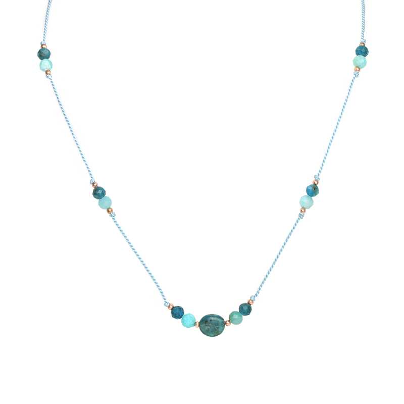 Šňůrkový náhrdelník s amazonitem a apatitem značky Agato představuje elegantní spojení přírodních minerálů a jemné estetiky. Světle modrá hedvábná šňůrka doplněná o korálky z vybroušeného amazonitu a apatitu tvoří harmonický celkový dojem. Pozlacené ocelové korálky dodávají šperku nádech luxusu. Tento náhrdelník nejen zvýrazní Váš dekolt, ale také symbolizuje odvahu a inspiraci. Amazonit pomáhá zmírňovat úzkost a přináší klid, zatímco apatit podporuje kreativitu a osobní růst. Délka šperku je nastavitelná od 32 do 60 cm, což zajišťuje pohodlné nošení. Obohaťte svůj styl šperkem, který v sobě spojuje krásu a duchovní význam.