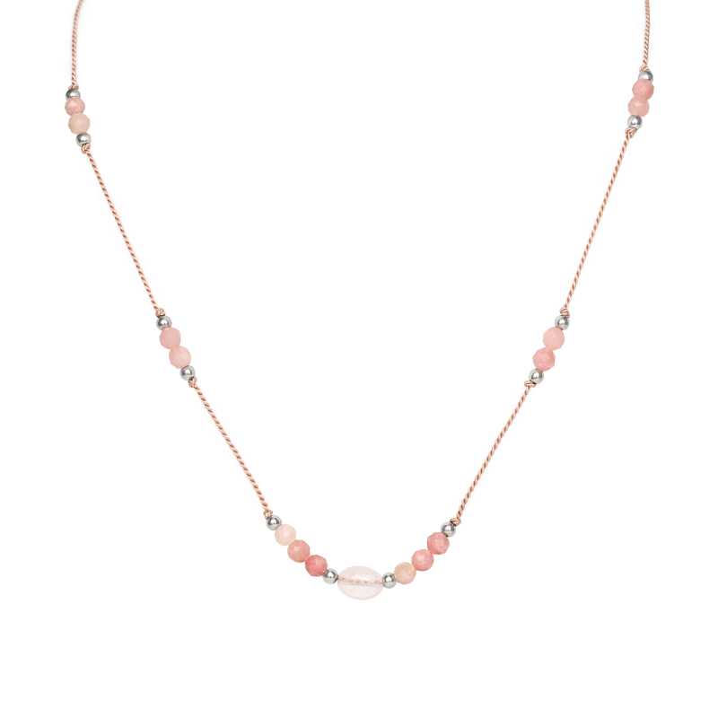 Elegantní šňůrkový náhrdelník značky Agato spojuje v sobě krásu růžové hedvábné šňůrky a jemně broušených korálků z angelitu a růženínu. Délka šperku je variabilní, což umožňuje perfektní přizpůsobení každému dekoltu. Angelit, často nazývaný „kámen míru“, přináší vnitřní klid a podporuje duchovní růst, zatímco růženín, známý jako „kámen lásky“, posiluje důvěru a harmonii ve vztazích. Tento náhrdelník nejenže vynikne mezi ostatními šperky, ale také symbolizuje lásku a mír, což z něj činí ideální doplněk pro každou ženu, která hledá rovnováhu v životě. Kvalita použitých materiálů zaručuje dlouhou životnost a originální provedení, které si zamilujete.