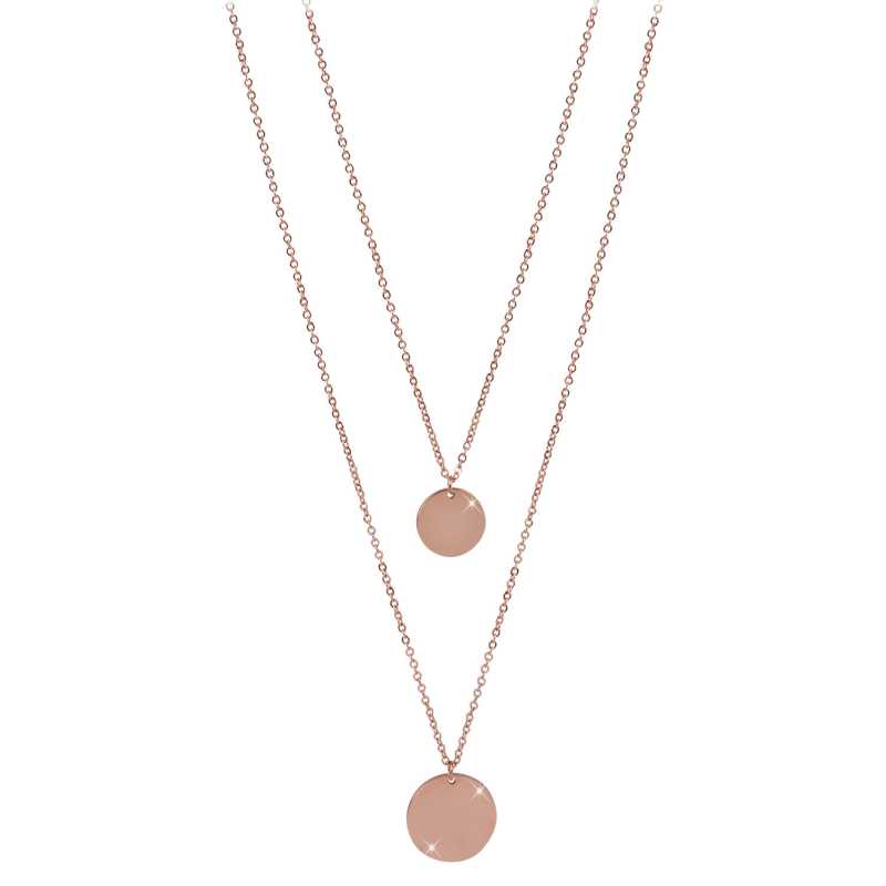 Dvojitý náhrdelník s kruhovými přívěsky z růžově pozlacené oceli značky Troli je dokonalým vyjádřením elegance a stylu. Jeho minimalistický design se skládá z dvou různě dlouhých řetízků, které jemně objímají dekolt. Přívěsky o průměru 1, 2 cm a 1, 7 cm dodávají šperku sofistikovaný vzhled, ideální pro každodenní nošení i speciální příležitosti. Tento náhrdelník symbolizuje propojení a harmonii, což z něj činí skvělý dárek pro blízkou osobu. Kvalita materiálu a povrchové úpravy zajišťuje dlouhou životnost a lesk, který osloví každou ženu. Vychutnejte si šperk, který dokonale podtrhne váš osobní styl.