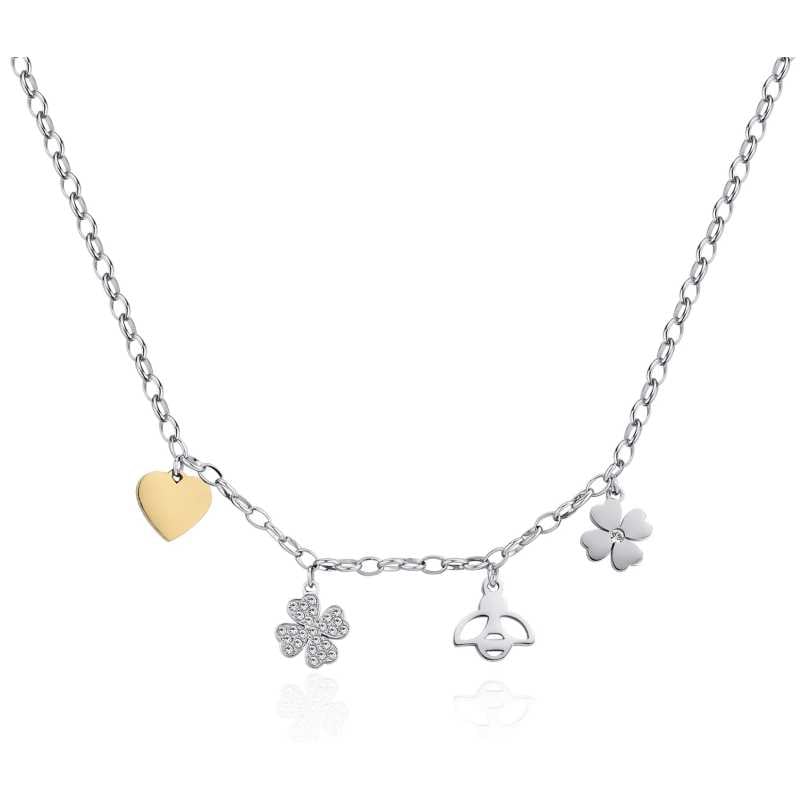 Elegantní bicolor náhrdelník od italské značky S'Agapõ je dokonalým doplňkem pro každou ženu, která touží po šperku s osobitým stylem. Délka 44 cm zaručuje pohodlné nošení, zatímco kvalitní ocel a PVD povlak zajišťují trvanlivost a odolnost. Tento náhrdelník je ozdoben přívěsky ve tvaru srdce, čtyřlístků a včelky, přičemž srdíčko je elegantně pokovené zlatem. Třpytivé krystaly na čtyřlístkách dodávají šperku jedinečný lesk, který upoutá pozornost. Podtrhněte svou přirozenou krásu a přineste do svého šatníku kousek, který symbolizuje štěstí a eleganci. Šperk je dodáván v originálním balení, ideální jako dárek.