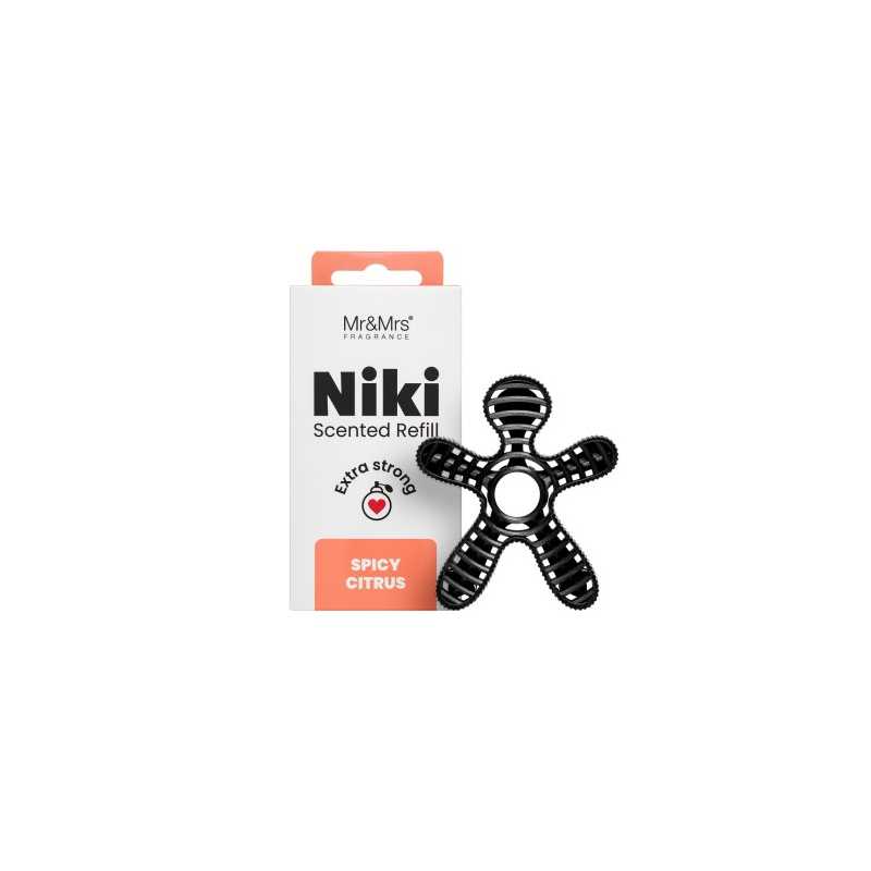 Mr&Mrs Fragrance Niki Scented Refill Spicy Citrus je ideální volbou pro ty, kteří chtějí osvěžit atmosféru ve svém voze. Tato unisex náplň přináší harmonii citrusových a kořeněných tónů, které dodají energii a vitalitu každé jízdě. Vůně, vyvinutá renomovanou značkou Mr&Mrs Fragrance, kombinuje grapefruit, pomeranč a bílé květy s dřevitými akordy a vanilkou, čímž vytváří příjemný zážitek pro všechny smysly. Snadná instalace do držáku na ventilační otvor zajišťuje optimální cirkulaci vůně. Dopřejte si luxusní pocit a užijte si svěží atmosféru během každé cesty.