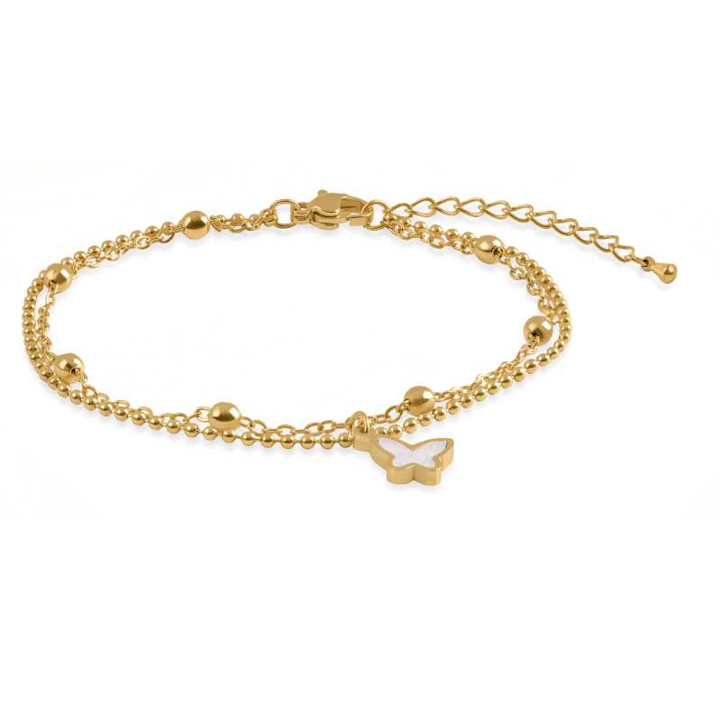 Dvojitý pozlacený náramek na nohu s motýlkem od značky Troli je elegantním doplňkem pro každou ženu, která touží po výjimečnosti. Tento šperk je vyroben z kvalitní oceli a ošetřen zlatým PVD povlakem, což mu dodává nejen atraktivní vzhled, ale také dlouhou trvanlivost. Skládá se ze dvou řetízků, které jsou ozdobeny drobnými ocelovými kuličkami a přívěskem ve tvaru motýlka, upraveným perletí. Délka náramku činí 25 cm s možností prodloužení o 5 cm, což zaručuje pohodlné nošení. Zapínání na klasickou karabinku zajišťuje snadné a bezpečné upevnění. Tento náramek osvěží váš letní outfit a dodá mu jedinečný šarm.