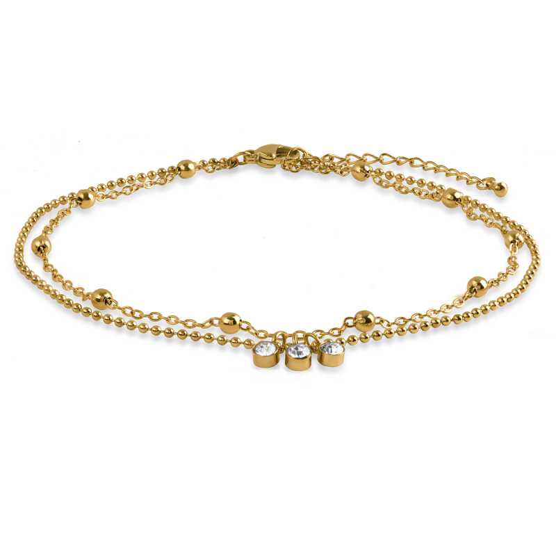 Dvojitý pozlacený náramek na nohu značky Troli je dokonalým spojením elegance a kvality. Vyrobený z odolné oceli, je ošetřen zlatým PVD povlakem, který zajišťuje dlouhotrvající lesk a ochranu proti poškrábání. Zirkony dodávají náramku jemný třpyt, který oživí každý letní outfit. Pro zajištění jeho krásy je doporučeno vyhnout se kontaktu s vodou a chemikáliemi. Náramek o délce 25 cm s možností prodloužení o 5 cm se pohodlně nosí díky zapínání na karabinku. Troli se pyšní kvalitními materiály a precizním zpracováním, což zaručuje spokojenost každé nositelky.