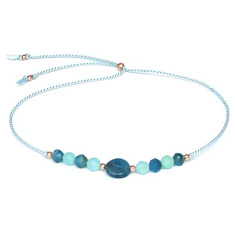 Šňůrkový náramek na nohu s amazonitem a apatitem od značky Agato je dokonalým doplňkem pro každou ženu, která chce zvýraznit svůj styl. Světle modrá hedvábná šňůrka s jemně broušenými korálky z amazonitu a apatitu v kombinaci s pozlacenými ocelovými elementy vytváří elegantní a harmonický vzhled. Délka náramku je nastavitelná až na 30 cm, což zaručuje perfektní fit pro každý kotník. Amazonit, známý jako „kámen odvahy“, pomáhá zmírňovat úzkost a přináší klid, zatímco apatit podporuje kreativitu a osobní růst. Tento šperk bude nejen ozdobou, ale i vaším talismanem pro pozitivní energii a sebevyjádření.