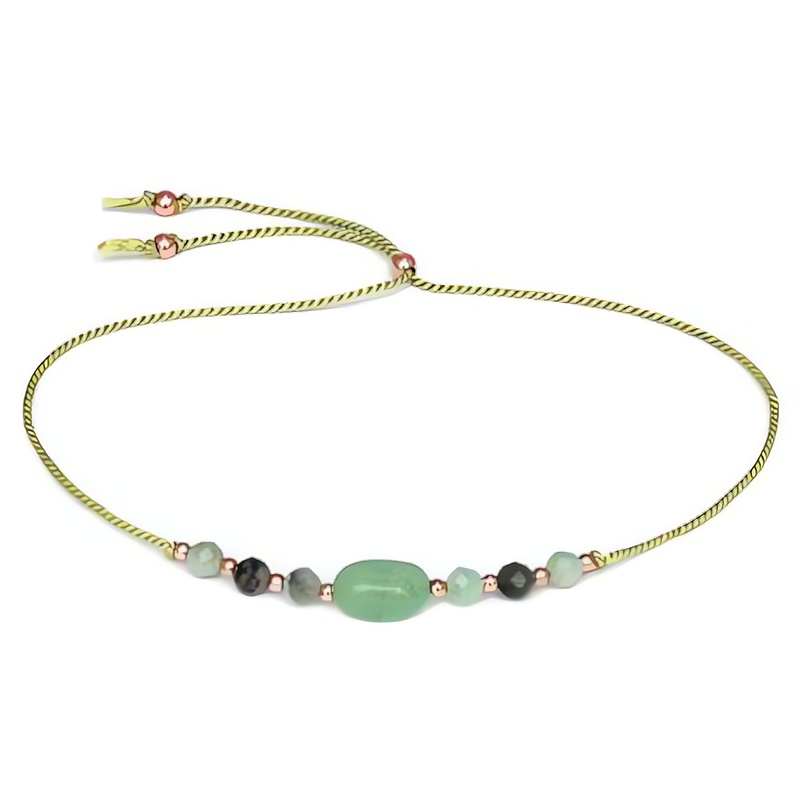 Šňůrkový náramek na nohu s aventurínem a smaragdem od značky Agato představuje elegantní spojení moderního designu a symboliky přírodních kamenů. Světle zelená hedvábná šňůrka je doplněna o precizně broušené korálky z aventurínu a smaragdu, které v sobě nesou sílu přírody. Aventurín symbolizuje růst a harmonii, zatímco smaragd přináší lásku a moudrost. Tento náramek, s možností nastavení délky až 30 cm, zvýrazní každý kotník a vnese do vašeho stylu nádech elegance. Růžově pozlacené ocelové prvky dodávají šperku luxusní vzhled. Užijte si pocit vnitřního klidu a štěstí s tímto výjimečným kouskem.