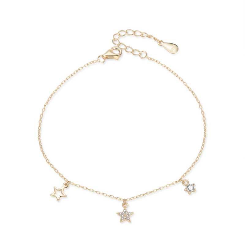 Elegantní pozlacený náramek s přívěsky značky MOISS představuje jedinečný kousek, který zkrášlí každé zápěstí. Vyrobený z kvalitního stříbra a pozlacený žlutým zlatem, tento šperk spojuje luxus s jemnou estetikou. Tři přívěsky s hvězdičkovým designem symbolizují naději a touhu po splnění snů. Osazení třpytivými kubickými zirkony dodává náramku jedinečný lesk, který okouzlí na první pohled. Délka náramku činí 17 cm a lze ji prodloužit až o 3 cm, což zajišťuje pohodlné nošení. Zapínání na karabinku přispívá k jeho praktičnosti a bezpečnosti. Ozdobte se tímto výjimečným šperkem, který v sobě snoubí kvalitu a styl.