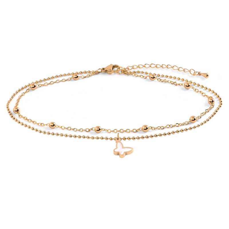 Elegantní dvojitý náramek s motýlkem od značky Troli je dokonalým spojením stylu a symboliky. Je vyroben z kvalitní oceli s luxusním zlatým PVD povlakem, který zajišťuje dlouhotrvající lesk. Skládá se ze dvou vzájemně propojených řetízků, mezi nimiž se na jedné straně jemně vyjímá přívěsek ve tvaru motýlka, jemně obohacený perletí. Tento design symbolizuje transformaci a svobodu, ideální pro moderní ženu, která si cení krásy a elegance ve svém životě. Náramek s délkou 23, 5 cm a možností prodloužení je pohodlně uzavíratelný karabinkou a stane se tak skvělým doplňkem pro každý outfit. Vyberte si šperk, který nejen ozdobí, ale také vyjádří vaši jedinečnost.