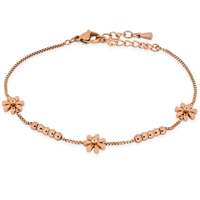 Jemný bronzový náramek s květinami od značky Troli je elegantním doplňkem pro každou ženu, která si potrpí na stylové šperky. Vyrobený z kvalitní oceli a pozlacený růžovým zlatem, náramek přináší harmonickou kombinaci jemnosti a odolnosti. Drobné ocelové kuličky a květinové motivy dodávají šperku jedinečný vzhled, který osvěží každý outfit. Nastavitelná délka 17, 5 cm s možností prodloužení o 4, 5 cm zajišťuje pohodlné nošení díky praktickému zapínání na karabinku. Tento šperk je ideální volbou pro ty, kteří hledají originální a rafinovaný doplněk. Dodáván v originálním balení, náramek je skvělým dárkem pro zvláštní příležitosti.