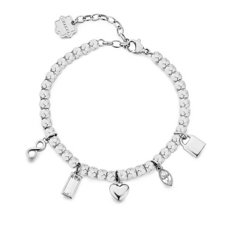 Romantický korálkový náramek značky Brosway je elegantním doplňkem, který dokonale ozdobí vaše zápěstí. Vyroben z kvalitní oceli, náramek vyniká přívěsky ve tvaru srdíčka, symbolu nekonečna a zámku, které symbolizují lásku a věčnost. Dva osazené čiré krystaly dodávají šperku nádech luxusu a podtrhují jeho nadčasovost. Délka náramku činí 18 cm, díky praktickému zapínání na karabinu se snadno navléká a přizpůsobuje. Tento šperk je ideální volbou pro ženy, které ocení spojení stylu a symboliky. Dodáván je v originálním balení, což z něj činí skvělý dárek.