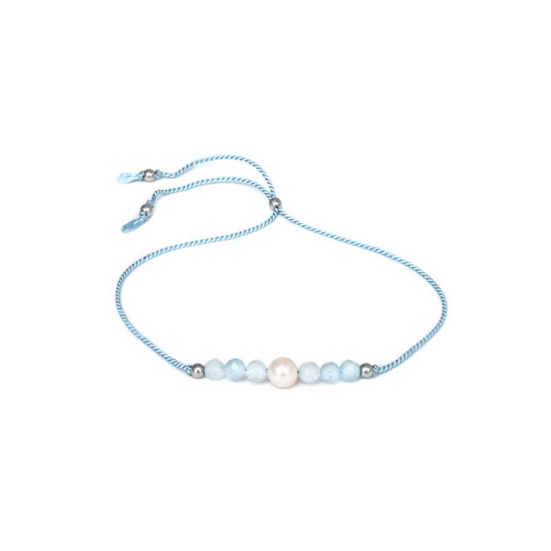 Šňůrkový náramek s akvamarínem a říční perlou od značky Agato spojuje elegance s harmonizací. Základem šperku je modrá hedvábná šňůrka, na které se nachází korálky z vybroušeného akvamarínu a pravé říční perly. Tento náramek je nejen stylovým doplňkem, ale také nositelem uklidňujících vlastností akvamarínu, který pomáhá odstraňovat stres a zvyšuje intuici. Říční perly pak přinášejí pocit bezpečí a emocionální rovnováhu. Díky posuvné sponě si můžete přizpůsobit délku náramku až do 27 cm. Představte si, jak zvýrazní vaše zápěstí a dodá vašemu vzhledu nádech sophistication.