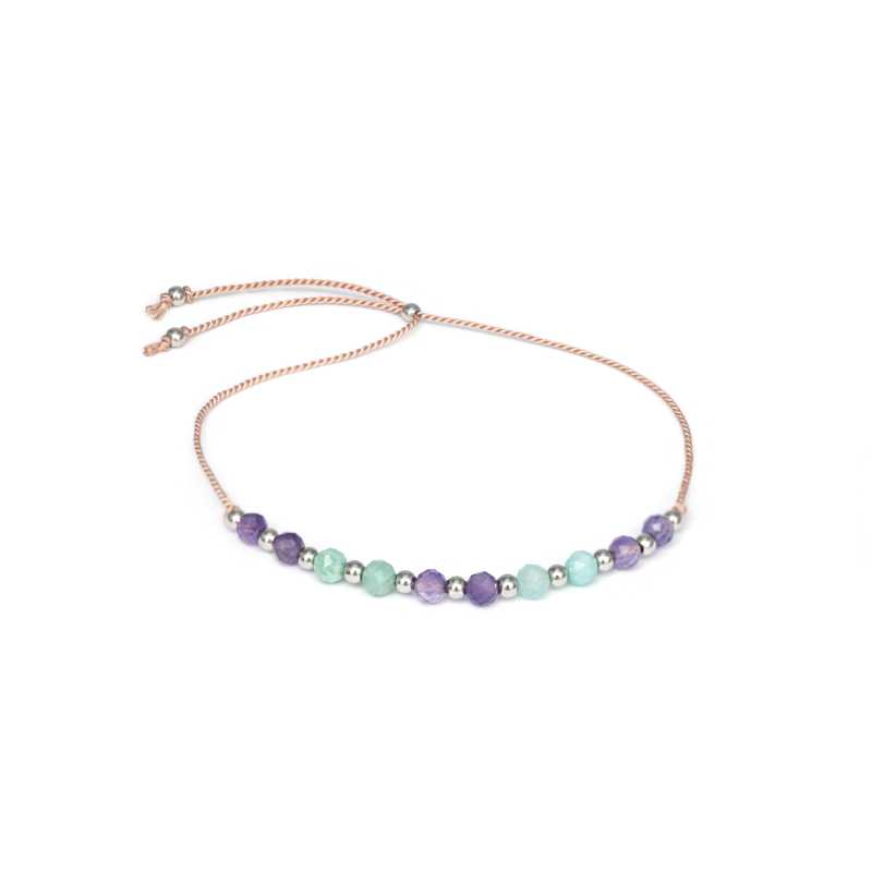 Elegantní šňůrkový náramek s amazonitem a ametystem od značky Agato přináší styl a harmonii do každodenního nošení. Základem je jemná hedvábná šňůrka, na níž jsou navlečeny korálky vyrobené z kvalitního amazonitu, ametystu a odolné oceli. Délku náramku si můžete snadno přizpůsobit až na 27 cm díky posuvné sponě, což zajišťuje maximální pohodlí. Amazonit, známý jako „kámen odvahy a pravdy“, pomáhá zmírňovat úzkost a přináší klid, zatímco ametyst podporuje meditaci a duchovní růst. Tento šperk nejenže zdobí vaše zápěstí, ale také přispívá k vašemu duševnímu blahu. Originální balení činí náramek skvělým dárkem pro každou ženu, která ocení krásu a pozitivní energii.
