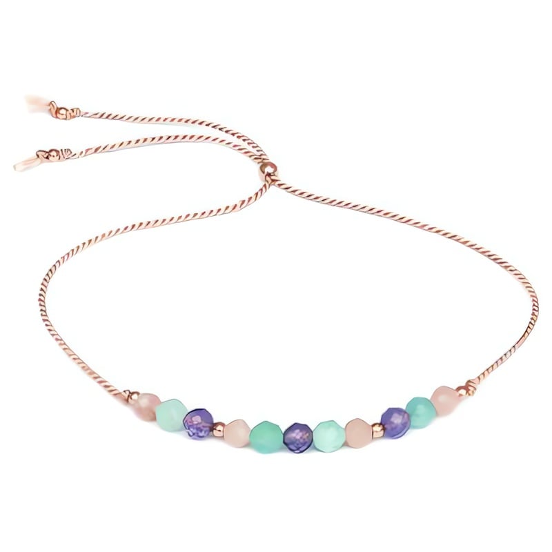 Šňůrkový náramek s amazonitem, ametystem a angelitem od značky Agato je synonymem kvality a elegance. Korálky z těchto minerálů, známých pro své léčivé vlastnosti, jsou navlečeny na jemné hedvábné šňůrce a doplněny ocelovými korálky pozlacenými růžovým zlatem. Povrchová úprava dodává šperku lesk a chrání jej před poškozením. Pro zachování jeho krásy doporučujeme vyhýbat se kontaktu s vodou a chemikáliemi. Původ a pečlivé zpracování značky Agato zaručují, že každý kus je unikátní a vysoce kvalitní, což z něj činí ideální doplněk pro každou příležitost.