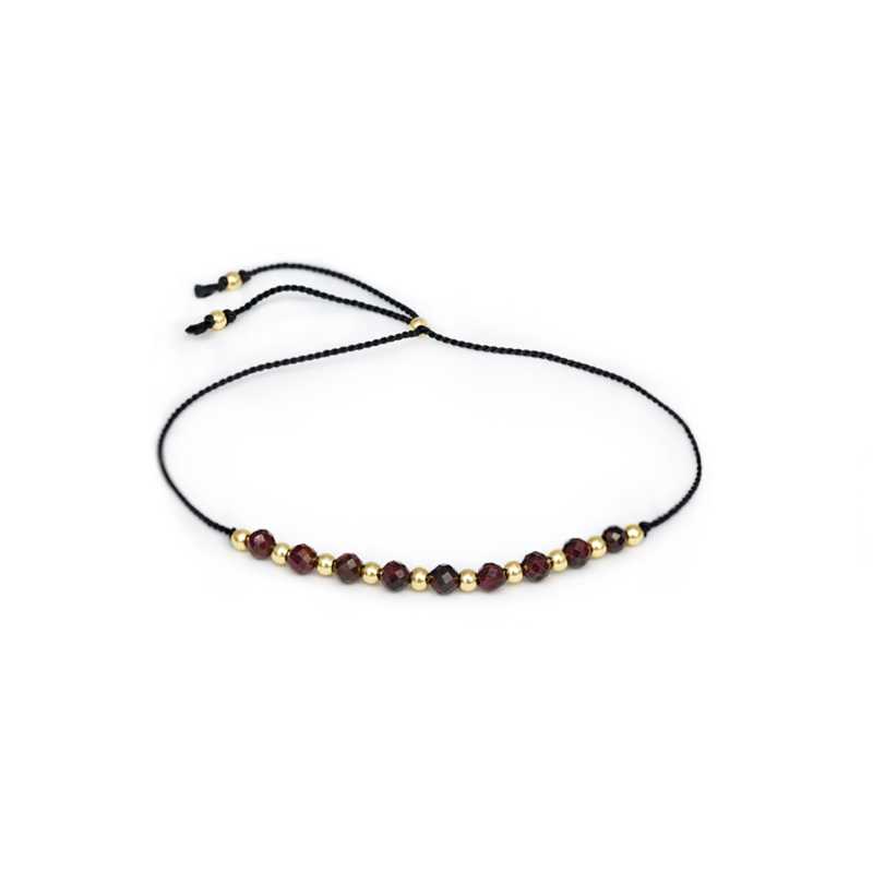 Šňůrkový náramek s korálky z granátu značky Agato spojuje kvalitní materiály a precizní zpracování. Hedvábná šňůrka v černé barvě vytváří elegantní základ pro vybroušené granátové korálky, které symbolizují sílu a vášeň. Pozlacená ocel dodává šperku luxusní vzhled a zajišťuje odolnost vůči každodennímu nošení. Pro zachování krásy a lesku doporučujeme náramek chránit před přímým kontaktem s vodou a chemikáliemi. Pravidelně otírejte suchým hadříkem, aby se odstranily nečistoty. Agato je známé svou kvalitou a důrazem na detail, což zaručuje, že každý šperk je unikátním kouskem s dlouhou životností.