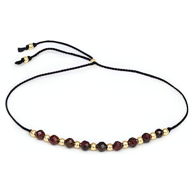 Stylový šňůrkový náramek s korálky z granátu od značky Agato je dokonalým doplňkem pro každou ženu, která chce zvýraznit své zápěstí. Základem je elegantní černá hedvábná šňůrka, na které jsou navlečeny vybroušené granátové korálky a pozlacené ocelové prvky. Délku náramku si snadno přizpůsobíte až do 27 cm díky praktické posuvné sponě. Granát, známý jako „kámen závazku“, posiluje vztahy a dodává odvahu i sebevědomí. Tento šperk nejenže vypadá skvěle, ale také chrání před negativními vlivy a pomáhá překonávat překážky. Originální balení činí z náramku ideální dárek.