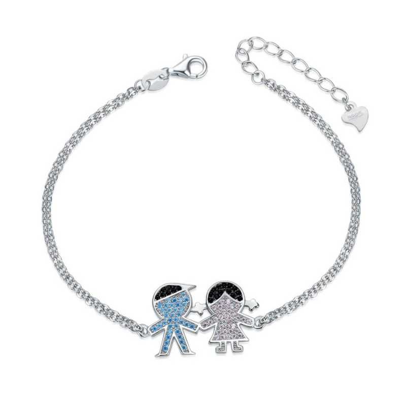 Tento elegantní stříbrný náramek od značky MOISS je vyroben z kvalitního stříbra 925/1000, které je rhodiováno pro zvýšení odolnosti a lesku. Jeho design vyniká ozdobou ve tvaru chlapečka s holčičkou, symbolizující rodinné pouto a přátelství. Náramek je zdoben modrými, růžovými a černými kubickými zirkony, které dodávají šperku nádhernou jiskru. S délkou 17, 5 cm a možností prodloužení až o 3 cm se perfektne přizpůsobí každému zápěstí. Zapínání na karabinku zajišťuje bezpečné nošení. Tento šperk je ideálním dárkem pro každou ženu, která chce vyjádřit, jak moc jí na rodině záleží.