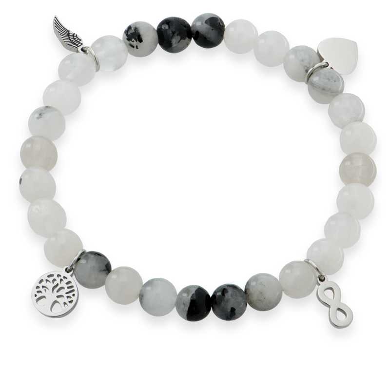 Korálkový náramek z rutilovaného křemene značky Troli spojuje eleganci s hlubokým významem. S průměrem korálků 0, 6 cm a čtyřmi stylovými přívěsky ve tvaru srdce, andělského křídla, stromu života a symbolu nekonečna představuje nejen krásný šperk, ale také nositele hodnot a ochrany. Pružné provedení zaručuje pohodlné nošení, ať už samostatně nebo ve vrstvených kombinacích s dalšími korálkovými náramky. Vyrobený z kvalitního křemene a oceli, tento šperk ocení všechny milovnice přírodních materiálů. Dodáván je v originálním balení, což z něj činí ideální dárek.