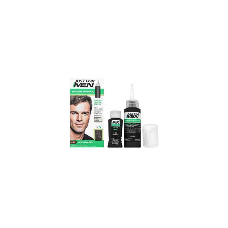 Just For Men Shampoo-in Haircolour H35 Medium Brown je ideálním řešením pro muže, kteří chtějí rychle a efektivně zakrýt šediny. Tento barevný šampon, navržený speciálně pro pánské vlasy, nabízí snadnou aplikaci a přirozený hnědý odstín, který dodává mladistvý vzhled. Obsahuje aktivní složky jako keratin pro posílení struktury vlasů, aloe vera pro hydrataci pokožky hlavy a vitamin E, který chrání vlasy před poškozením. Dlouhotrvající barva odolává každodennímu mytí a vnějším vlivům. Just For Men je perfektní volbou pro muže, kteří preferují jednoduchost a efektivitu v péči o vlasy. Aplikace je rychlá a výsledky jsou viditelné během chvilky.