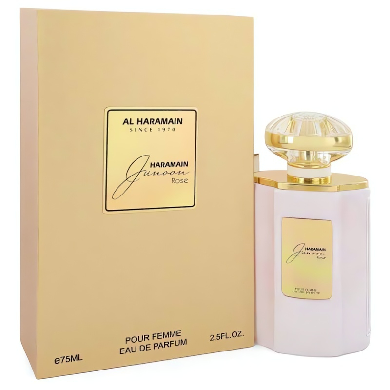 Junoon Rose je vůní, která ztělesňuje tajemství orientálního světa. Vznikala s láskou a precizností značky Al Haramain, která se pyšní tradicí výroby parfémů sahající až k počátkům arabské kultury. Tato parfémová voda je oslavou ženskosti, spojující svěží bergamot a ylang-ylang s romantickými tóny třešňového květu. V srdci se mísí omamná růže, pudrové tóny a likér amaretto, což vytváří jedinečnou harmonii. Hřejivá ambra a tonka na závěr dodávají hloubku a sofistikovanost. Flakon, inspirovaný orientálními motivy, zrcadlí eleganci a mystiku. Junoon Rose je více než jen vůně; je to příběh, který vás zve na cestu do srdce Orientu.