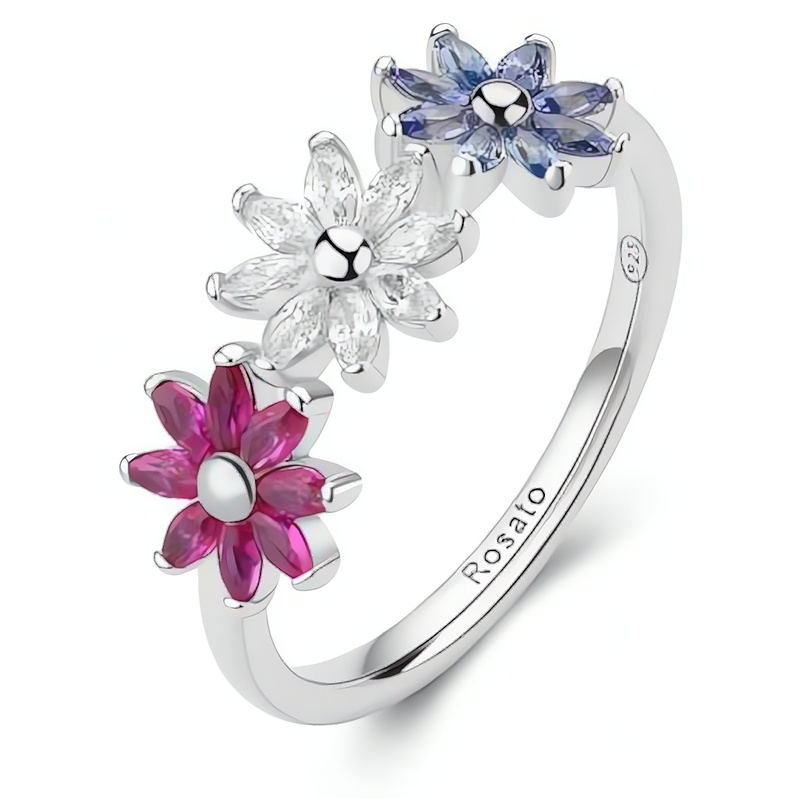 Stříbrný květinový prsten Gaia od italské značky Rosato vás osloví svým jedinečným designem, který je inspirován krásou přírody. Tento šperk, vyrobený z kvalitního stříbra 925/1000, je osazen třemi okouzlujícími květinami v různých barvách, které podtrhují jeho originalitu. Kubické zirkony v jasně čiré, fuchsiové a modré barvě dodávají prstenu jemný lesk a eleganci, což z něj činí ideální doplněk jak pro každodenní nošení, tak pro slavnostní příležitosti. Prsten Gaia symbolizuje krásu, lásku a radost ze života, což z něj činí dokonalý dárek pro každou ženu. Dopřejte si kousek přírody na dosah ruky a užijte si kvalitu, která je pro značku Rosato typická.