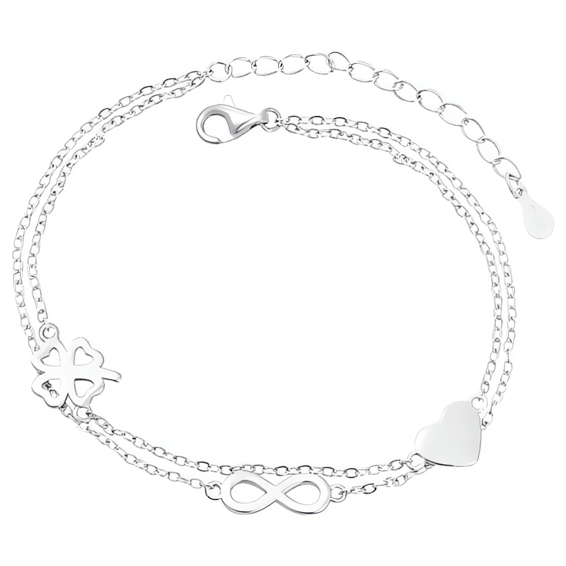Dvojitý náramek ze stříbra značky Beneto, pro ženy, v sobě spojuje eleganci a symboliku štěstí. Je precizně vyroben z kvalitního stříbra 925/1000 a jeho rhodiovaný povrch zajišťuje dlouhotrvající lesk a minimalizuje alergické reakce. Stylové dvojité provedení je ozdobeno motivy srdce, čtyřlístku a nekonečna, které společně vyjadřují touhu po lásce, štěstí a věčnosti. Náramek má délku 17 cm s možností prodloužení o 4 cm, což zaručuje dokonalé padnutí na každé zápěstí. Ozdobte se šperkem, který nejen vypadá skvěle, ale také nese hluboký smysl.