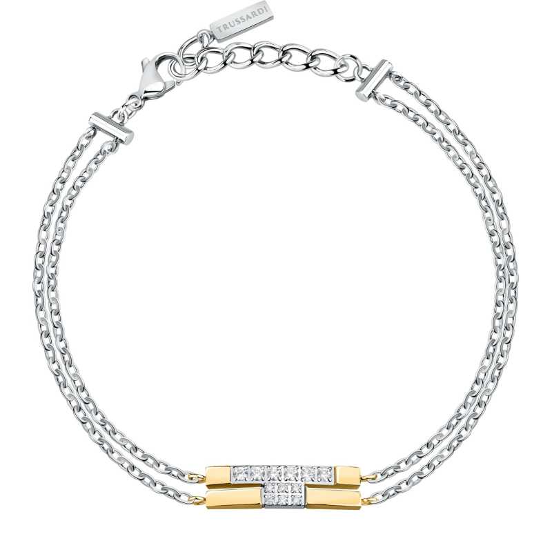 Dvojitý ocelový bicolor náramek se zirkony T-Logo od značky Trussardi je dokonalým spojením elegance a kvality. Vyroben z prvotřídní oceli, zajišťuje dlouhou životnost a odolnost. Pozlacení ozdob žlutým zlatem dodává šperku luxusní vzhled, zatímco precizně broušené čiré zirkony vytvářejí okouzlující třpyt. Pro zachování krásy náramku se doporučuje vyhýbat se kontaktu s vodou a chemikáliemi. K údržbě postačí jemný hadřík na lesk. Tento šperk, pocházející z Itálie, není jen módním doplňkem, ale také projevem elegance a vkusu.