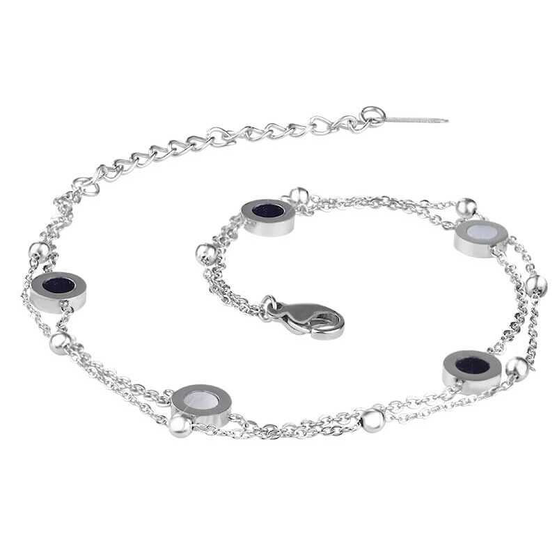 Dvojitý ocelový náramek na nohu značky Troli je ideálním doplňkem pro každou ženu, která chce podtrhnout svou ženskost a eleganci. Tento jemný šperk kombinuje dva řetízky; jeden je zdoben drobnými korálky, zatímco druhý nese elegantní přívěsky s černým a perleťovým středem. Náramek se snadno přizpůsobí díky délce 21 + 5 cm a praktickému zapínání na karabinku. Vyrobený z kvalitní oceli, zaručuje dlouhou životnost a odolnost. Ozdobte své nohy tímto jedinečným šperkem, který se hodí jak k dennímu, tak k večernímu outfitu. Náramek je dodáván v originálním balení, což z něj činí skvělý dárek pro blízké.