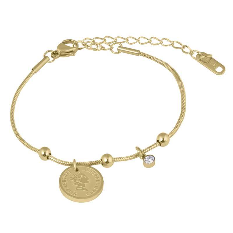 Elegantní ocelový náramek Coin Gold od značky Troli je ideálním doplňkem pro každou ženu, která ocení styl a kvalitu. Vyroben z prvotřídní oceli a pozlacený žlutým zlatem, tento náramek se pyšní jemnými ocelovými korálky a přívěsky, které dodávají šperku na originalitě. Zirkonový přívěsek s čirým kamenem přitahuje pozornost a dodává náramku elegantní nádech. S délkou 15 cm a možností prodloužení až o 5 cm se skvěle přizpůsobí každému zápěstí. Zapínání na karabinku zajišťuje pohodlné nošení po celý den. Tento šperk je dodáván v originálním balení, ideální jako dárek pro vaše blízké.