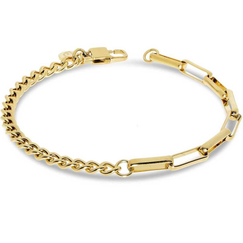 Moderní pozlacený náramek pro muže značky Liu Jo je skvělým doplňkem pro každého, kdo hledá styl a kvalitu. Náramek o délce 21 cm je vyroben z kvalitní oceli, která je povrchově upravená zlatým PVD povlakem, což mu dodává elegantní vzhled a odolnost. Skládá se ze dvou různých typů článků, které vytvářejí atraktivní kontrast a zaujmou na první pohled. Tento šperk symbolizuje mužnost a sebevědomí, ideální pro každodenní nošení nebo speciální příležitosti. Zapínání na karabinu zajišťuje bezpečné nošení. Náramek je dodáván v originálním balení, což ho činí perfektním dárkem.